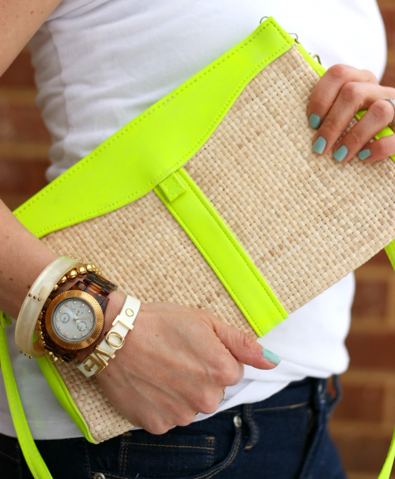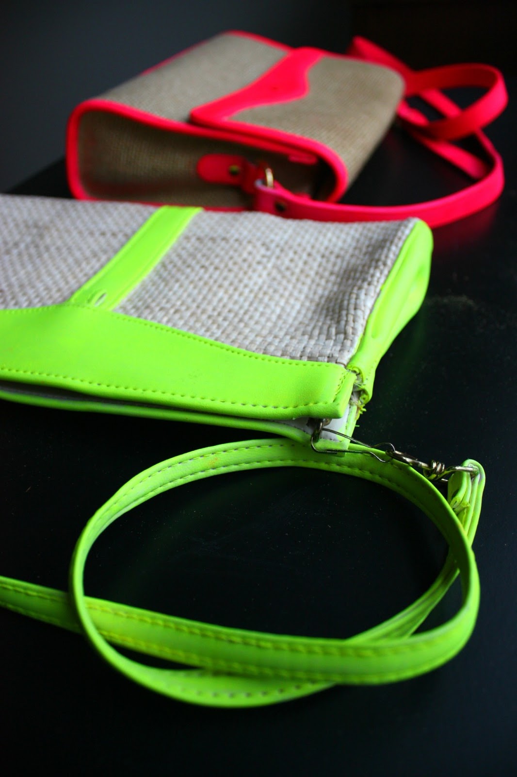 I have a MAJOR obsession with the neon + neutral trend, especially pops of neon on neutral purses. While I was in NYC a few weeks ago, I noticed these bags in the windows of Marc Jacobs and Joe Fresh and wanted to rip those suckers off those boney mannequins and make a run for it. However, I have a habit of changing my purse with the season (sometimes in between) and as a result, I can’t bring myself to spend over $20 on a bag. So, over the weekend I took matters into my own hands and satisfied my neon + neutral lusts by picking up a couple of plain purses from Goodwill ($1.99 each!), and giving them a major upgrade.