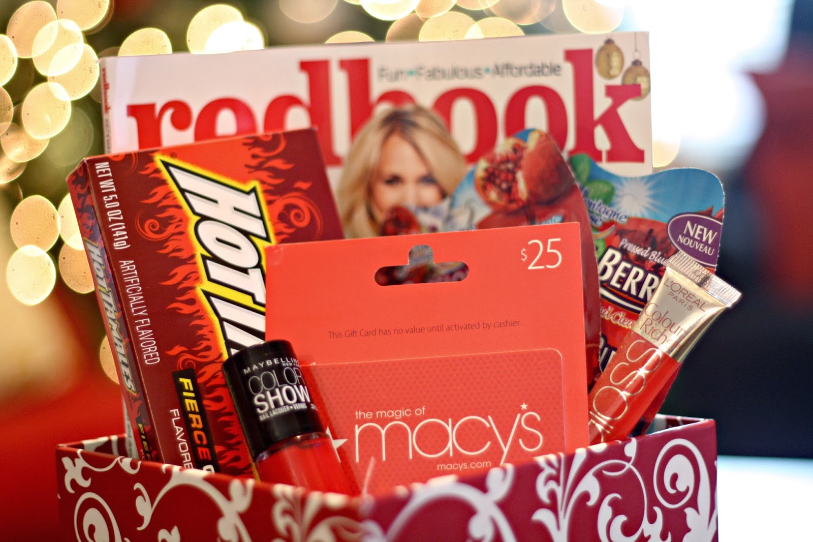 Pretty, huh? We took a Macy’s gift card that we picked up from Smith’s, and without having to go to any other stores, whipped up a gift perfect for the fashionista in your life, complete with fashion mag, sassy red nail polish and lip gloss, face masks, and hot tamales. Easy. Affordable. Thoughtful. Get under my tree.