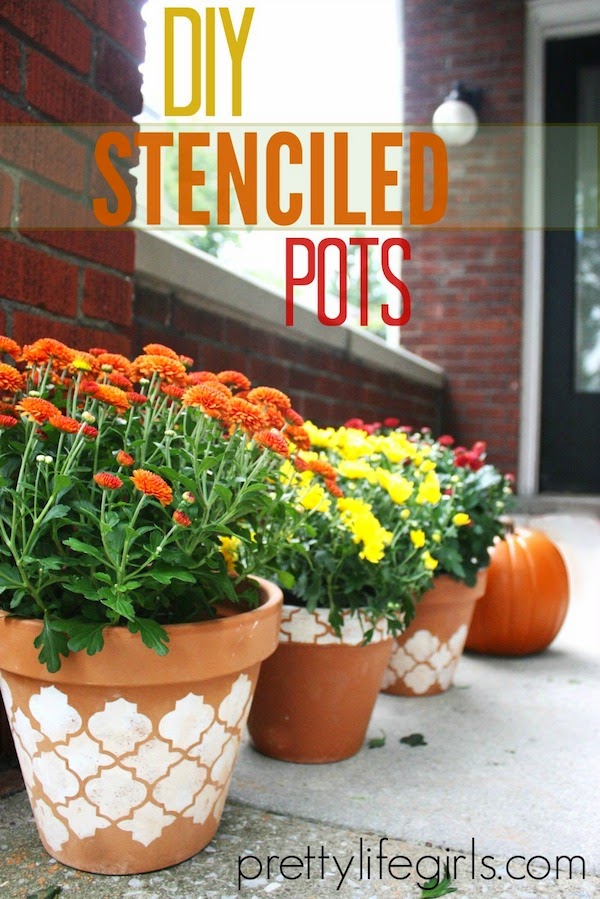 It’s FAAAAALL!!! Shall we celebrate with a fall DIY project? Let’s do it. I’m going to show you how I glammed up some plain pots to make room for one of my favorite treasures of the fall season, MUMS! I love those suckers. They are hearty, they are colorful, and it doesn’t take many of them to make a big impact. And, since I love my mums I decided that they needed pots that deserved their loveliness. So, when our friends at FolkArt Stencils and Paints sent us some of their fab products recently I knew what had to be done. Here’s what I did: