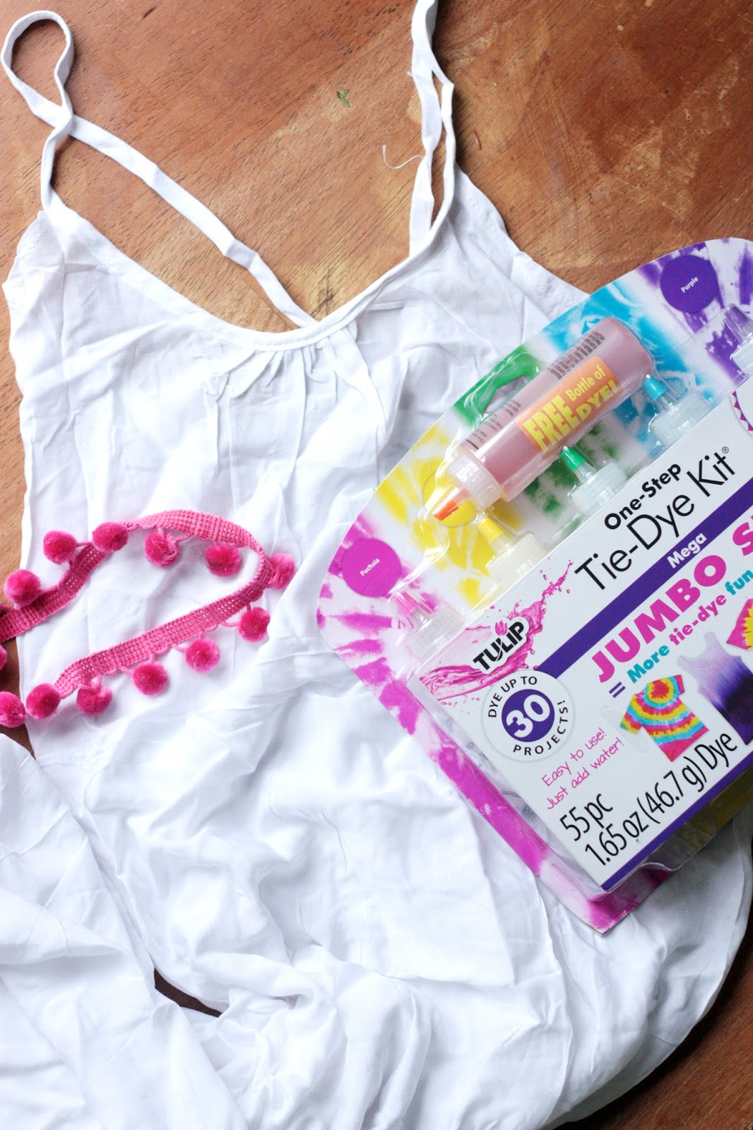 I love everything about this tutorial. First, it’s all so simple to do especially when you are using a Tulip One-Step Tie-Dye Kit like I did that includes everything you need to make tie-dye magic. Plus, by using tie-dye you always get a one-of-a-kind fabric. Next, the price for this sucker blows Anthro’s out of the water. The whole thing was well under $20! Last, adding that little pom-pom detail takes it to the next level of cuteness. It’s all so good and the result is you looking adorable at the beach. Here is how I did it: