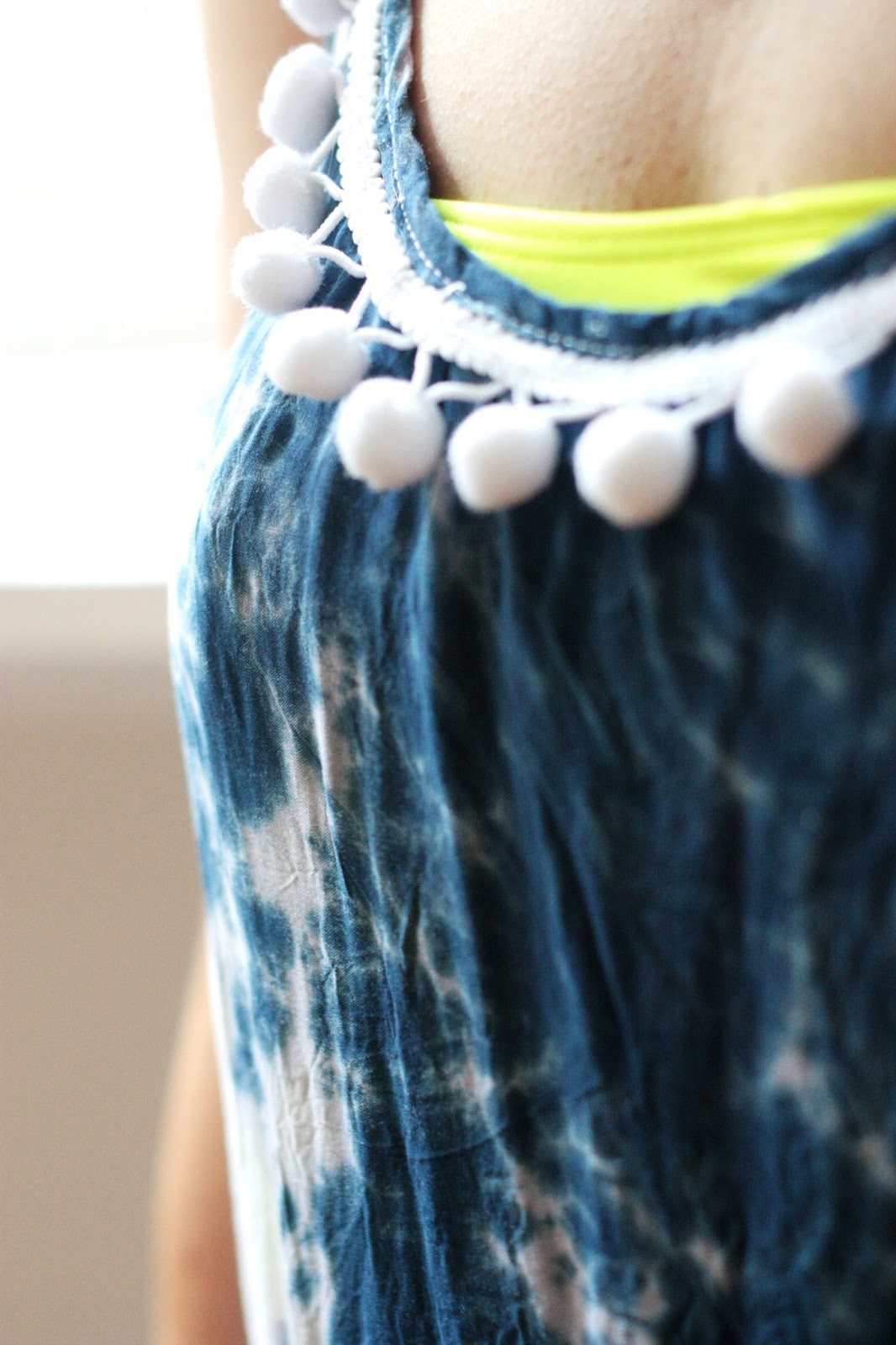 5. Once the dress completely dry, attach the pom poms to the neckline. I did this using fabric glue in the glue gun and it was SO simple. You can also just run it through a sewing machine. That’s it! You’re done!