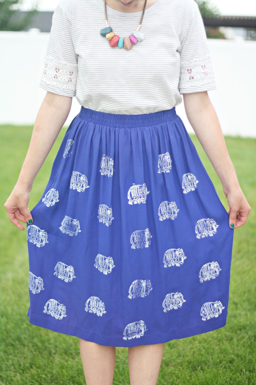 I was cleaning out my closet the other day, and I found a bunch of items I decided I wanted to revive and with a new season at our heels, my wheels really got turning. This blue skirt was one of them – it’s the perfect length, pretty color, and so comfortable. But it was just a little boring for my taste, so I decided to stamp it up to make it more interesting. This DIY Elephant Stamped Skirt was so easy to make (as usual), and is such a fun new/old addition to my closet!