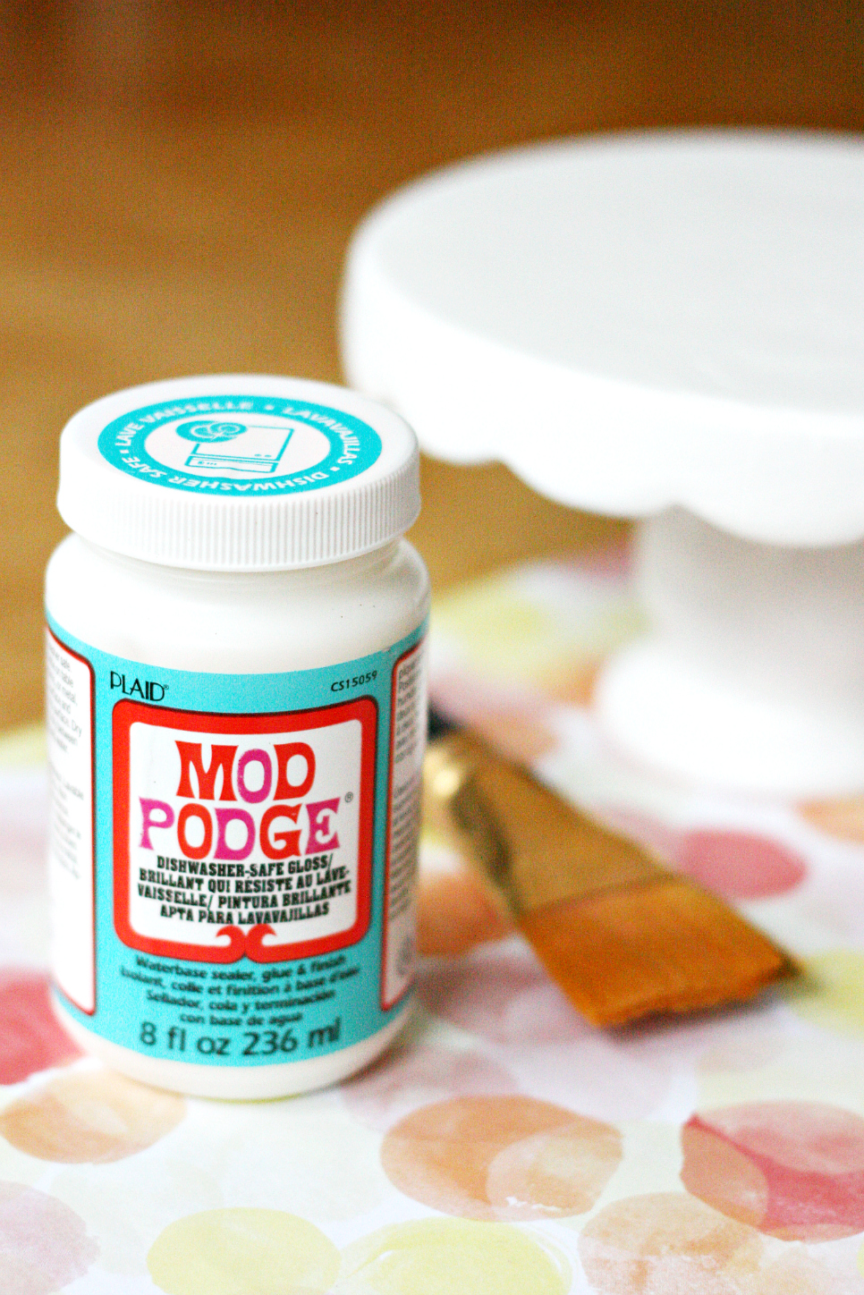 Now that spring is here, I’ve been looking for pretty ways to incorporate some spring colors and patterns in my home. After visited the craft store recently and coming across some new spring prints, I knew that all it would take was some colorful paper and Mod Podge to add some spring touches to my life. I decided to start with dressing up one of my old cake plates, and dress it up for a spring brunch with my girlfriends. This project was so easy and the results are darling! Here’s how I did it: